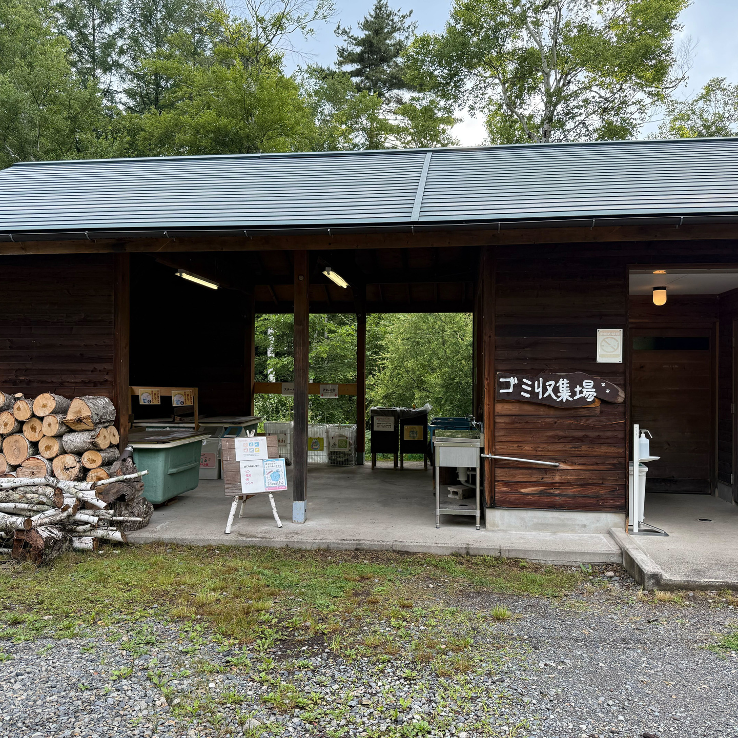 薪のストックハウスと分別ゴミの収集所です。受付でお渡しする指定のゴミ袋をご使用ください。