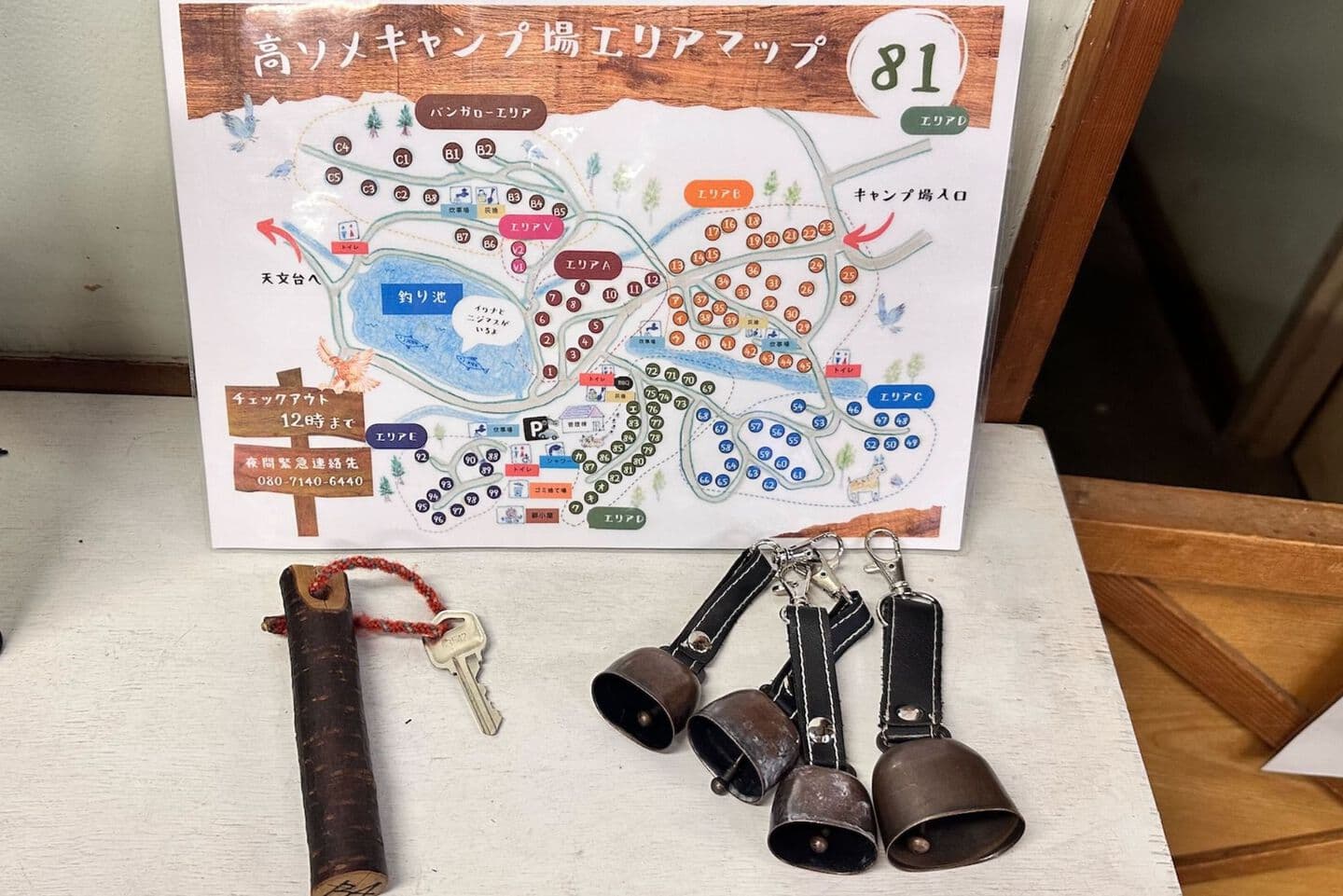 - キャンプの片付けが済んだところで、管理棟にお越しいただき『サイトカード』、『熊すず』と、使用したお客様は『バンガローの鍵』、『レンタル品』の返却をしてチェックアウトの手続きは完了です。